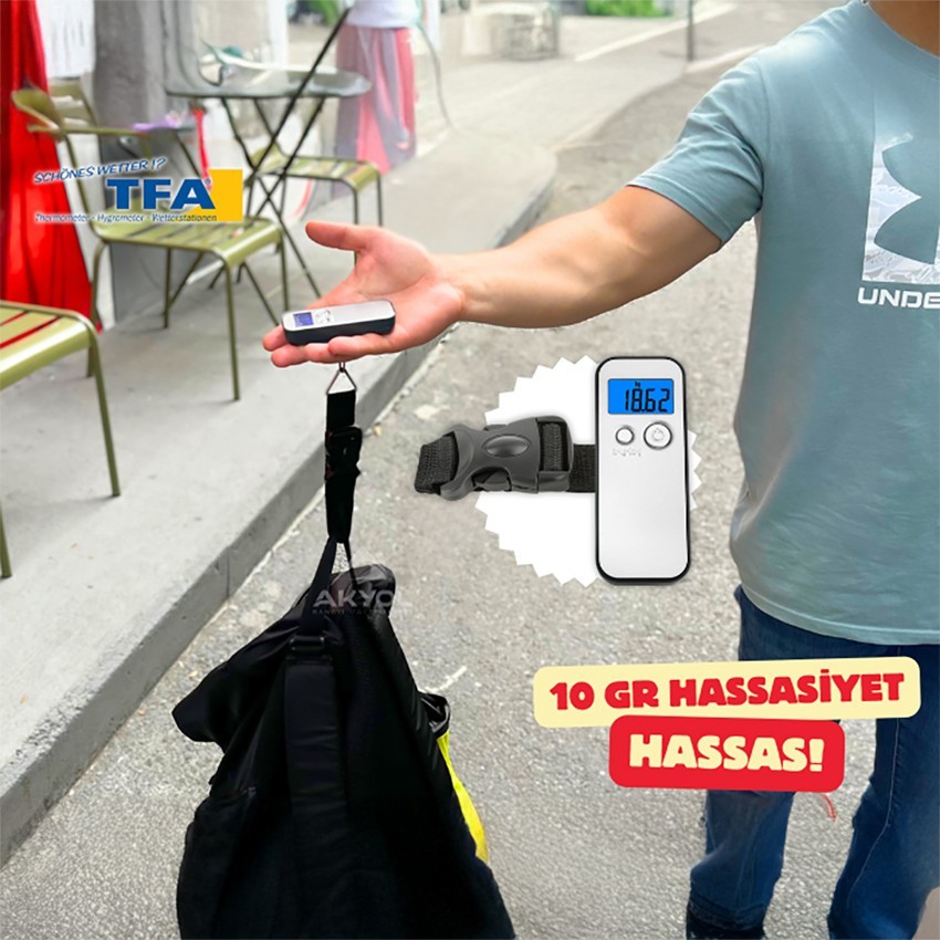 Tfa 50.3000.54 dijital bagaj terazisi, seyahatleriniz öncesinde bavulunuzun ağırlığını kolayca belirlemenizi sağlayan, 40 kg kapasiteli ve kompakt bir tartım cihazıdır. Havaalanında check-in sırasında ekstra ücret ödemekten ya da bagajınızı yeniden düzenlemekten kaçınmak için bu bagaj kantarı, bavulunuzun ağırlığını önceden ölçme fırsatı sunar. Seyahat dostu tasarımıyla, her gezgin için vazgeçilmez bir araçtır.