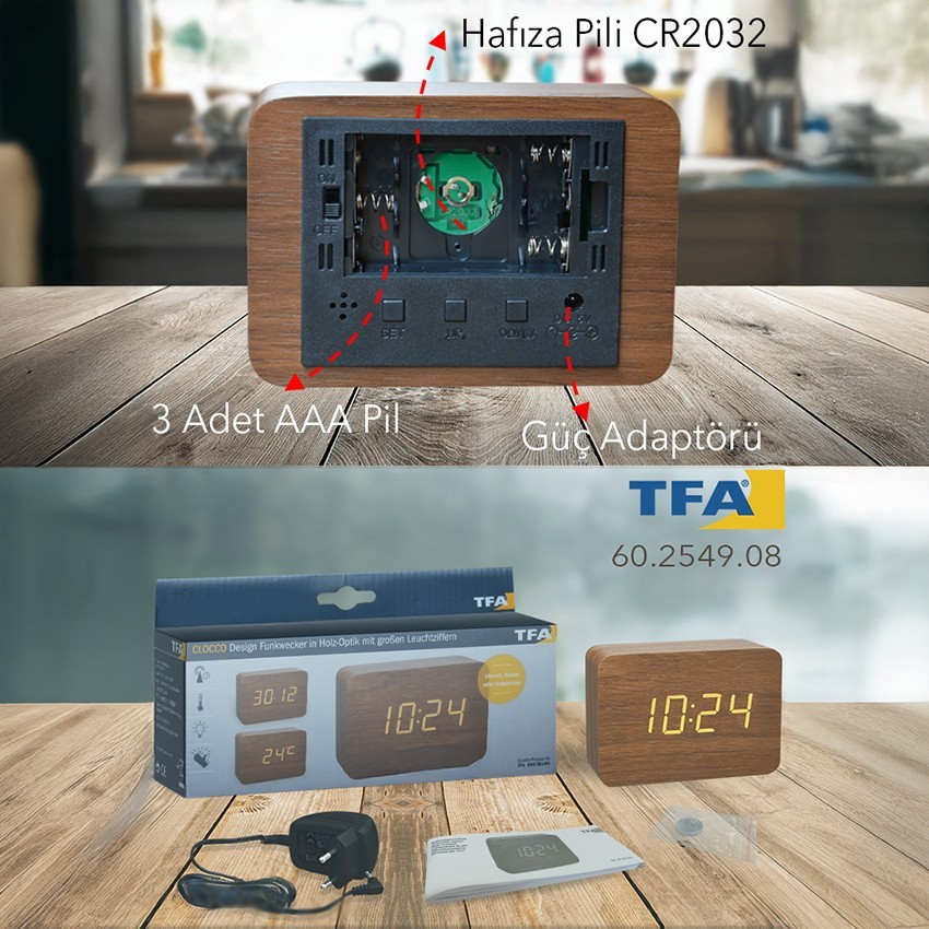 TFA 60.2549.08 ahşap saat termometre cihazı kuvvetli uyarıcı seslerde cihaz pildeyken ekran aydınlanır.