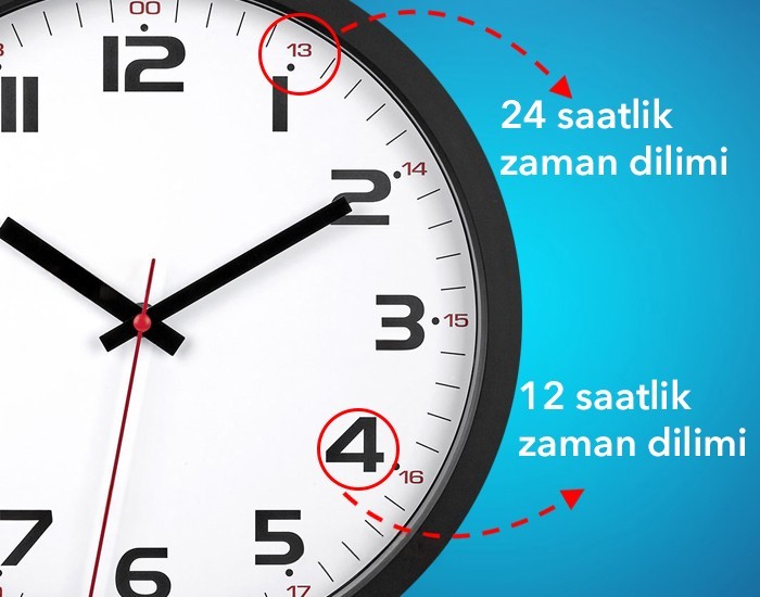 - Analog duvar saatin kadranında bulunan rakamlar 12 ve 24 saatlik zaman dilimini göstermektedir.