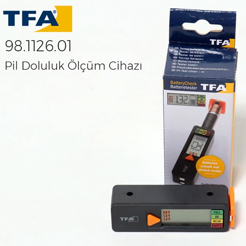 TFA 98.1126.01 pil doluluk ölçüm cihazı; küçük ebatlara sahip, 9V, AAA, AA, LR44, CR2032, C ve D model gibi pillerin doluluk oranını görebileceğiniz portatif bir ölçüm cihazıdır.