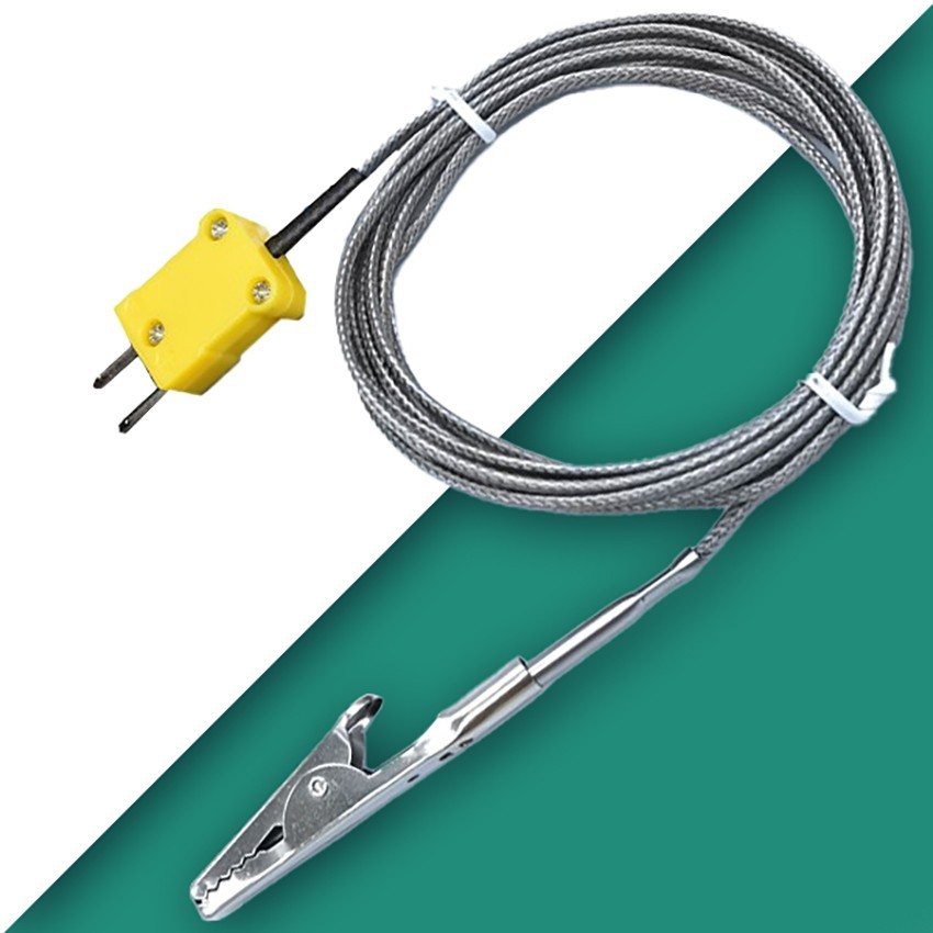 Alligator timsah ağızlı K tipi termokupl, 200ºC sıcaklığa kadar dayanıklı yapısıyla, ızgara, fırın ve endüstriyel materyaller gibi sıcak yüzeylere kolayca tutturularak sıcaklık ölçümü yapılmasını sağlar. K tipi termokupl sensörü, paslanmaz çelik üst örgü ile kaplanmış, dayanıklı ve uzun ömürlü bir yapıya sahiptir.
