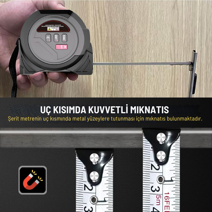 - Şerit metrenin uç kısmında metal yüzeylere tutunması için mıknatıs bulunmaktadır.