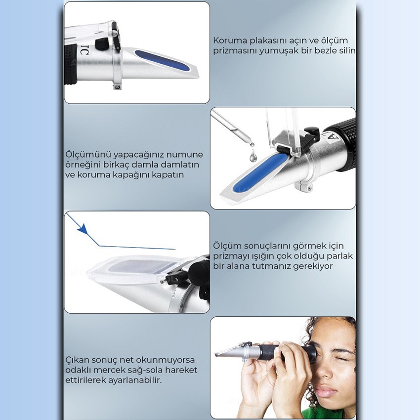 Refraktometreyi uç kısmında bulunan numunenin damlatıldığı eğik prizmanın bulunduğu taraf ışığa bakacak şekilde gövdeden tutarak elinize alınız ve kapak kapalı konumda iken cihazın dürbün bölümünü gözünüze konumlandırıp gördüğünüz ölçüm tablosundaki değeri okumaya çalışın. Görmüş olduğunuz değerler net değil ise dürbünün hemen üzerindeki ayar halkasını çevirerek ölçüm tablosunu sağa sola çevirip netlik ayarı yapabilirsiniz.