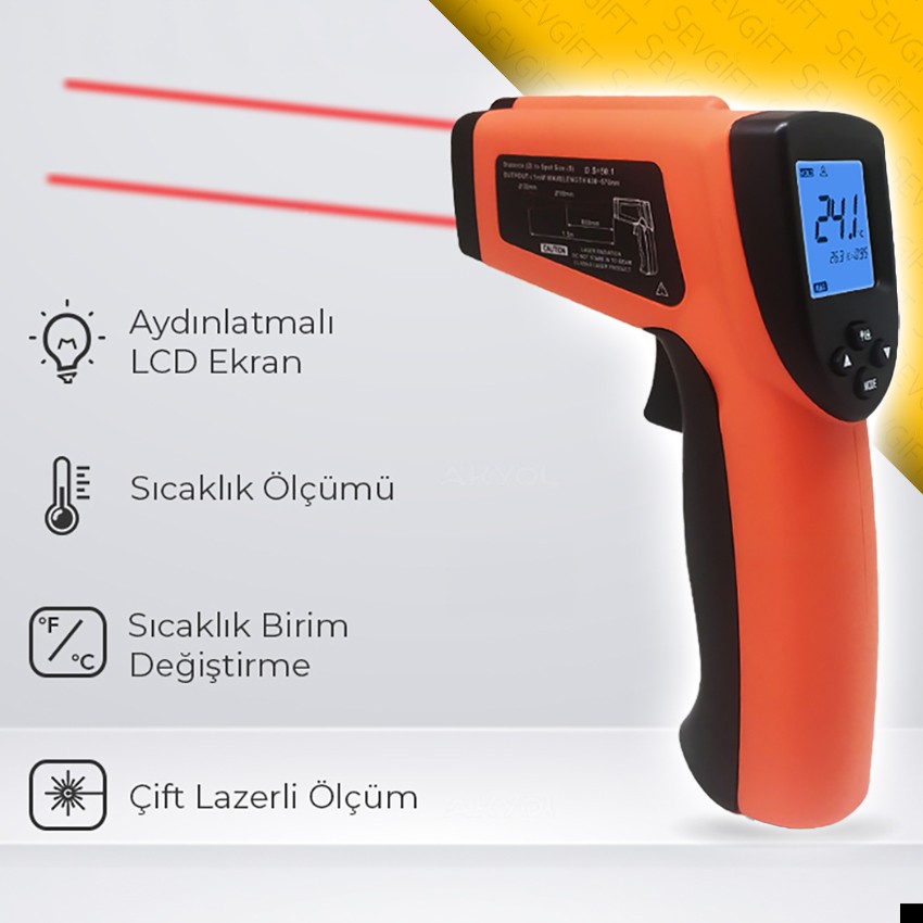 Çift lazerli kızılötesi termometre, -50°C ile 1600°C arası temassız sıcaklık ölçümü yapabilen yüksek hassasiyetli infrared cihazdır. Sanayi, fırın ve teknik ölçümler için hızlı ve güvenilir sonuçlar sunar.
