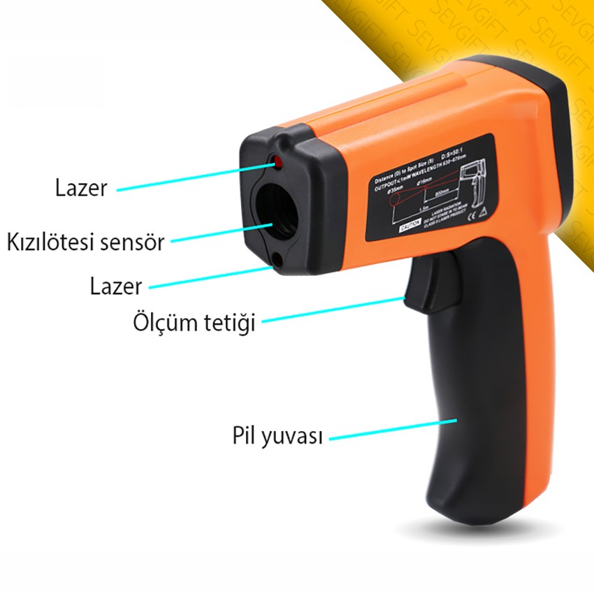 Lazer işaretleyici, ölçüm yapılacak noktayı göstermek için kullanılır; asıl ölçümü yapan kısım kızılötesi sensördür. Bu sayede kullanıcı, hedef yüzeyi doğru şekilde belirleyerek hızlı ve güvenilir ölçümler gerçekleştirebilir.