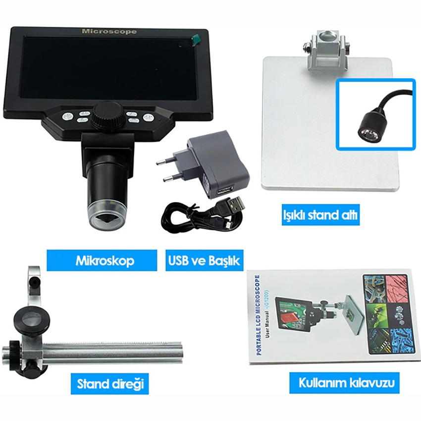 G-1200 mikroskop, metal stand, Stand ışıklandırması, USB şarj başlığı, 2 adet usb kablo