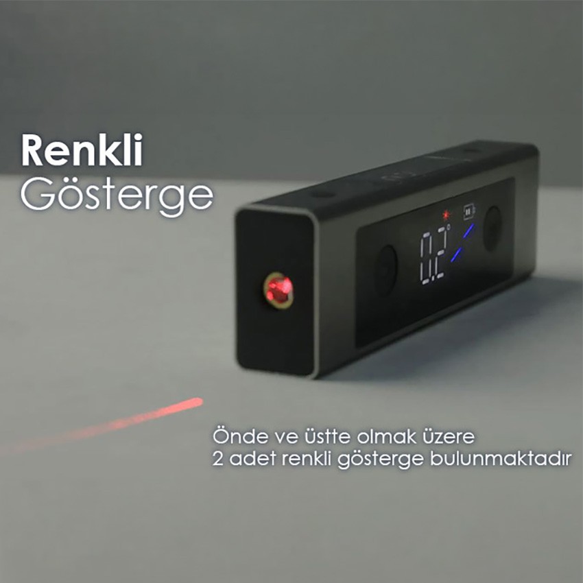 Mini dijital eğim ölçer; X ve Y ekseninde ±40° ölçüm aralığı, 0.1° çözünürlük ve çift lazer işaretleme ile hassas hizalama sağlar. Kompakt tasarımı ve şarjlı bataryası ile inşaat, otomotiv ve marangozluk uygulamalarında idealdir.