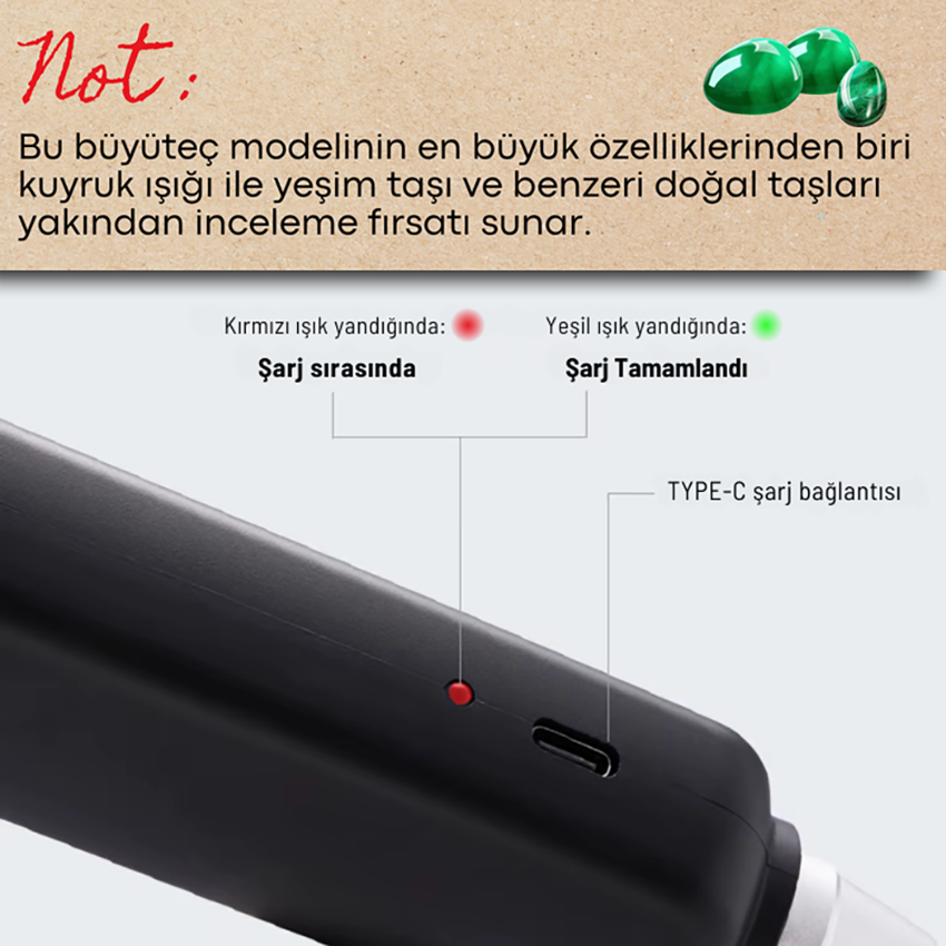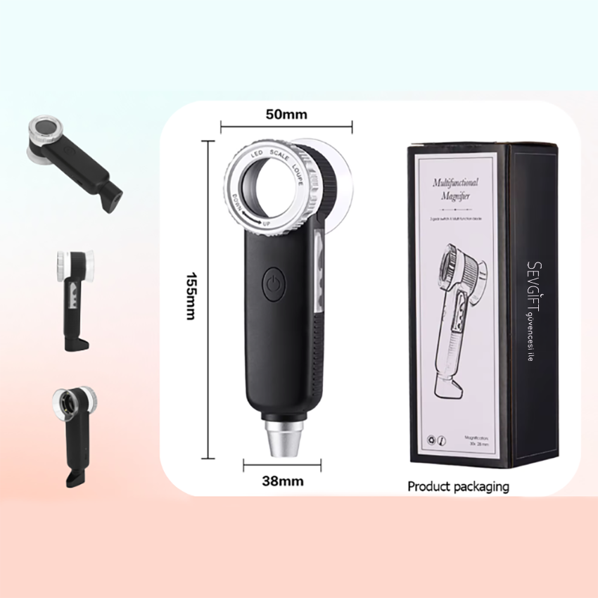 30X el büyüteci; yüksek çözünürlüklü çift katmanlı lens, beyaz LED, UV mor ışık ve sarı yardımcı ışık ile detaylı inceleme sağlar. USB şarjlı lityum pili sayesinde mücevher, koleksiyon ve küçük parçaların incelenmesi için idealdir.