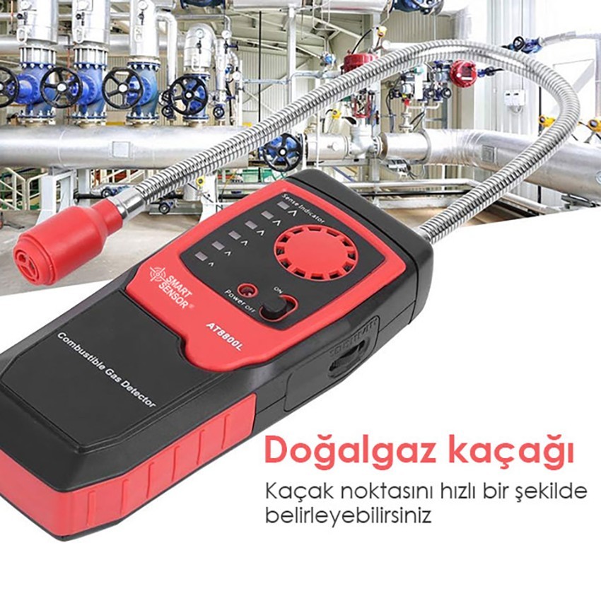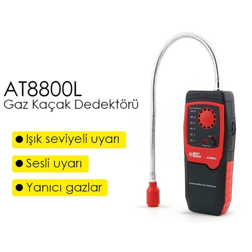 Smart Sensor AT8800L yanıcı gaz kaçağı dedektörü; ışıklı bir artıp azalabilen gaz sızıntı seviye göstergesine sahip olan dedektördür. Yanıcı olan gaz sızıntılarını tespit edebilen bu cihaz; hidrokarbonlar diye adlandırılan yani metan, doğal gaz, etan, propan, benzen, asetilen, propan, pentan, heksan, gaz yağı, toluen madde ölçümleri yanı sıra bunların haricinde halojenlenmiş hidrokarbonları yani metil klorür, üç klorür, vinil klorür, alkolleri (metanol, etanol) vb. gazları ölçebilen dedektör çeşididir.