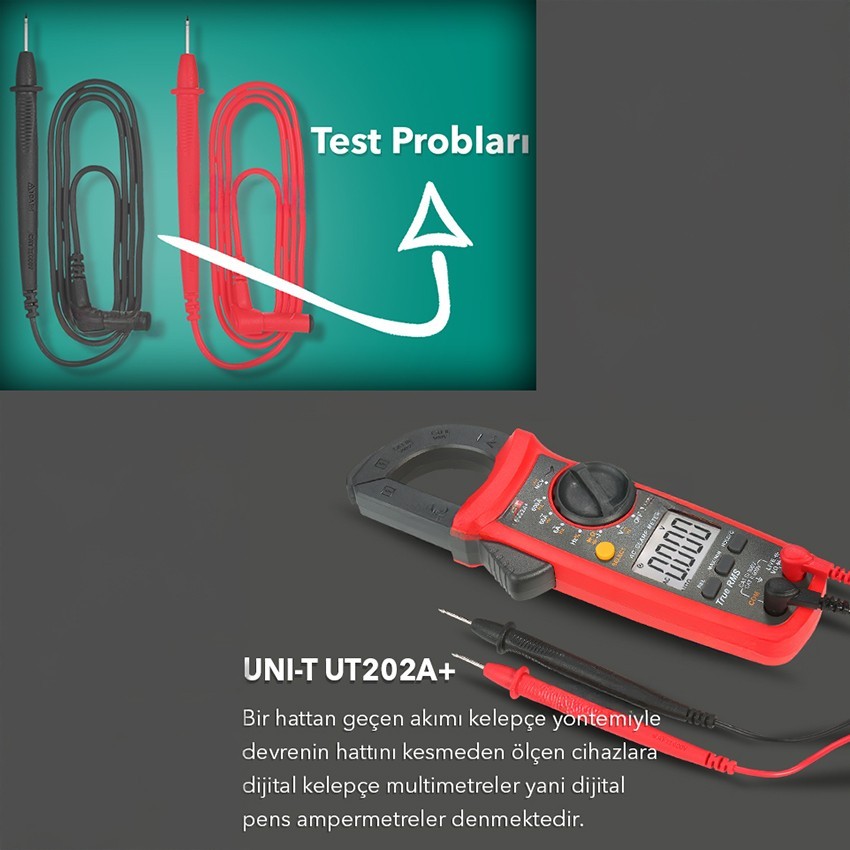 UNI-T UT202A+ dijital pensampermetre; sıkışık güç kabloları ya da iletkenlerde temassız akım ölçümü yapmanıza olanak sağlar. Kolay kavrama mekanizması sayesinde her bir kabloyu kolay ve güvenli bir şekilde kavrayabilmektedir. Bir hattan geçen akımı kelepçe yöntemiyle devrenin hattını kesmeden ölçen cihazlara dijital kelepçe multimetreler yani dijital pensampermetreler denmektedir.