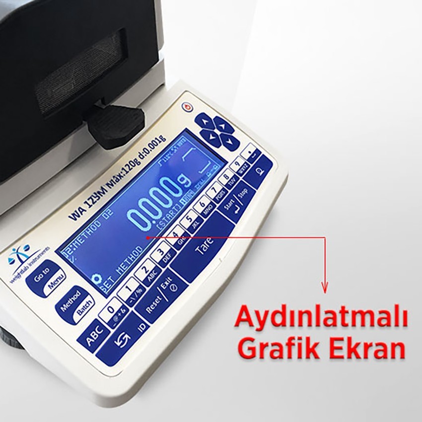 WA123M nem tayin cihazı; maksimum 120 gram numune ölçüm kapasitesi ve 40 farklı kullanıcı