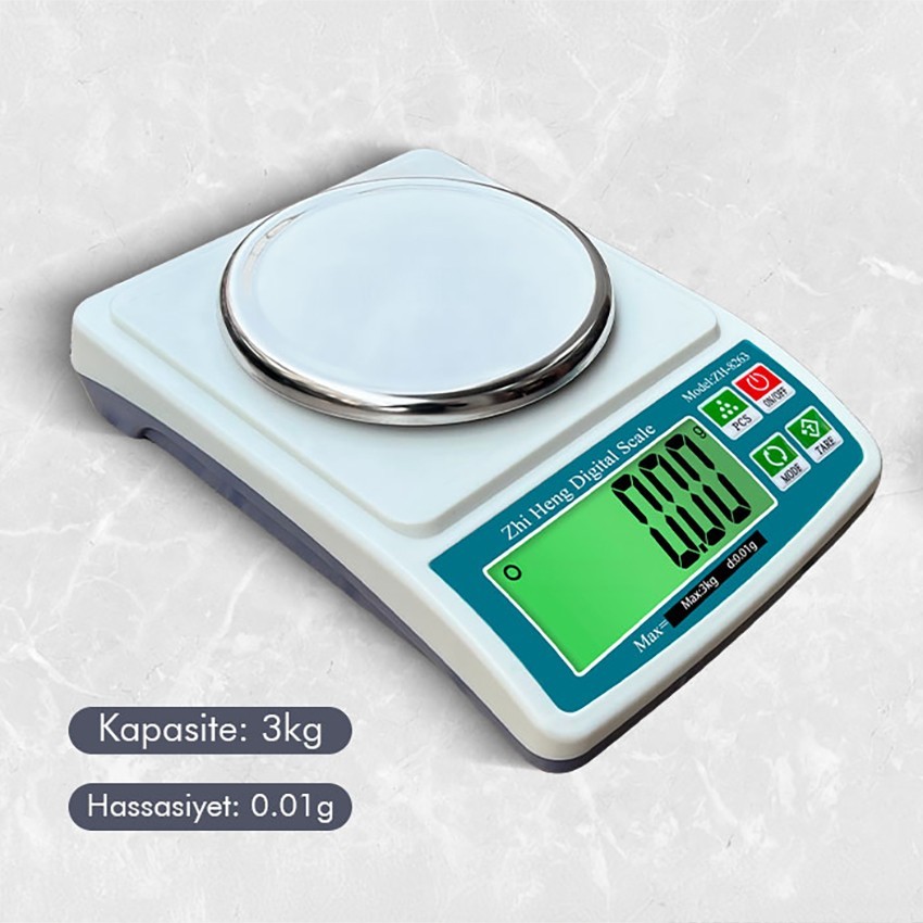 - ZH-8263, 0.01 gram duyarlılıkla ölçüm yapabilen ve maksimum 3 kilogram ağırlığa kadar tartım kapasitesine sahip bir dijital hassas terazidir.